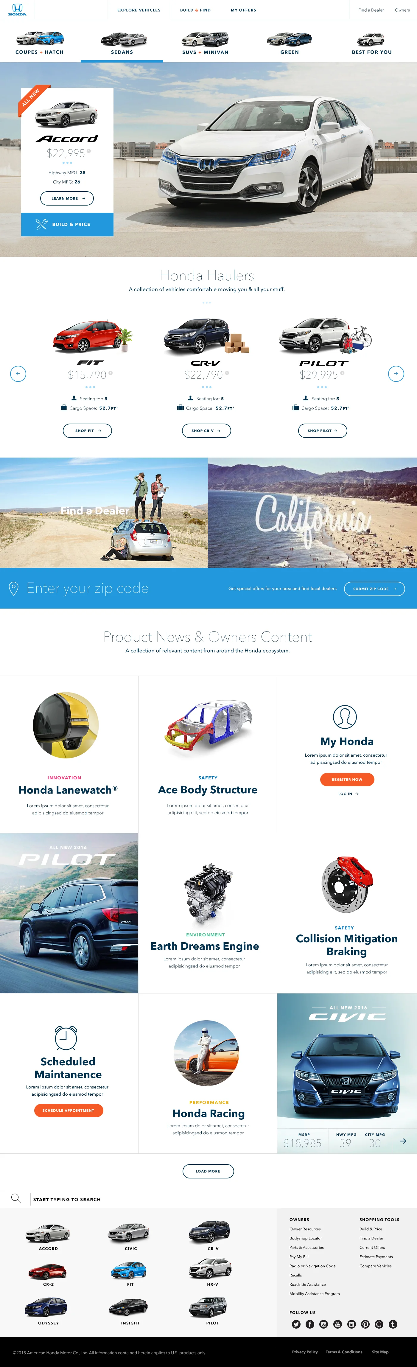 The design challenge here is all about creating some information resolution that let's users understand the different between grid items at a glance. Anything with an icon is related to Honda Owners content, any spotlight or isolated image is related to a product feature and corporate pillar and any full bleed block is a featured vehicle.