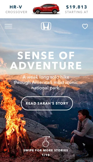 One of my first ideas to structure the page was to create a series of stories that examine the lifestyle each vehicle is designed to compliment. In this case it's the HR–V, an active lifestyle crossover that messed well with the narrative of an outdoorsy adventure. Theres a push down that lives above the hero image / nav that shows which car is associated with that story. Swiping down reveals a full vehicle menu.