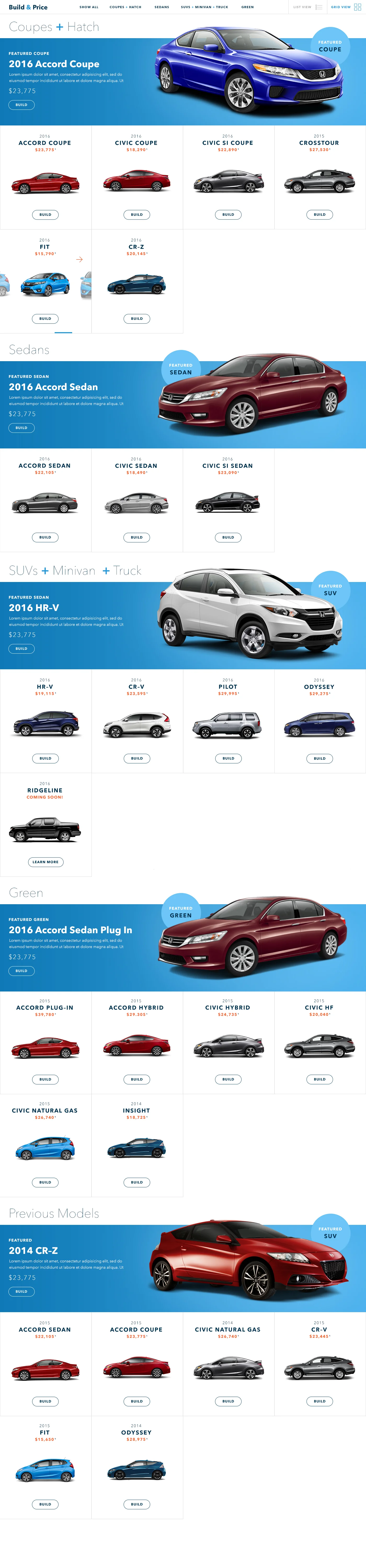 Vehicles were broken down by body style with each body style having a hero vehicle associated with it that is displayed in the hero. In the hero we show a full bleed image and a product card that lets users jump straight into Build & Price or they can Learn More via the model landing page.