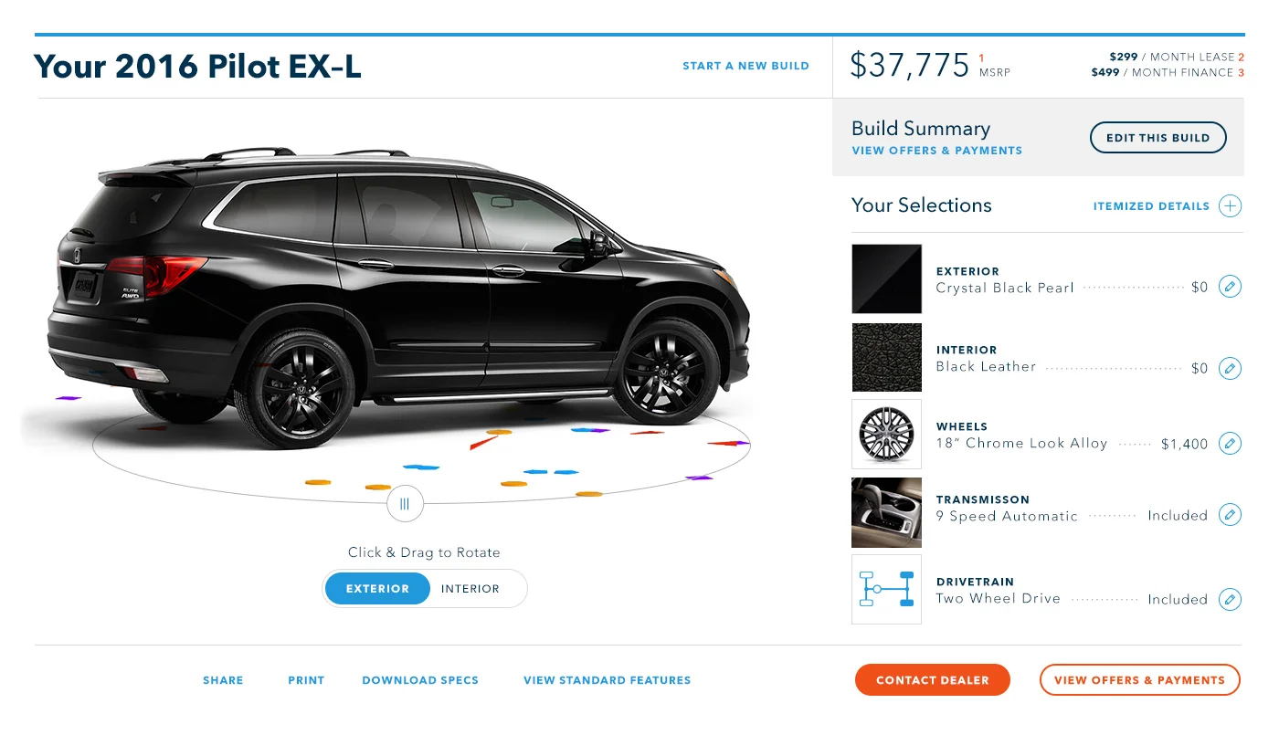 I wanted to do something that i hadn't already seen on other automotive sites. I wanted something that would be sticky, that would follow the user and present a limited amount of simplified options. The thing with Honda is that they design trims to be fairly comprehensive. This isn't a Porsche, where you can customize the color of the accent stitching on the seats or choose one of 6 in dash mechanical clocks. For the most part, what you see is what you get once you're into a specific trim. I felt that you could present that information cleanly in the context of a model landing page if you focus the options that are actually customizable into a sticky nav.