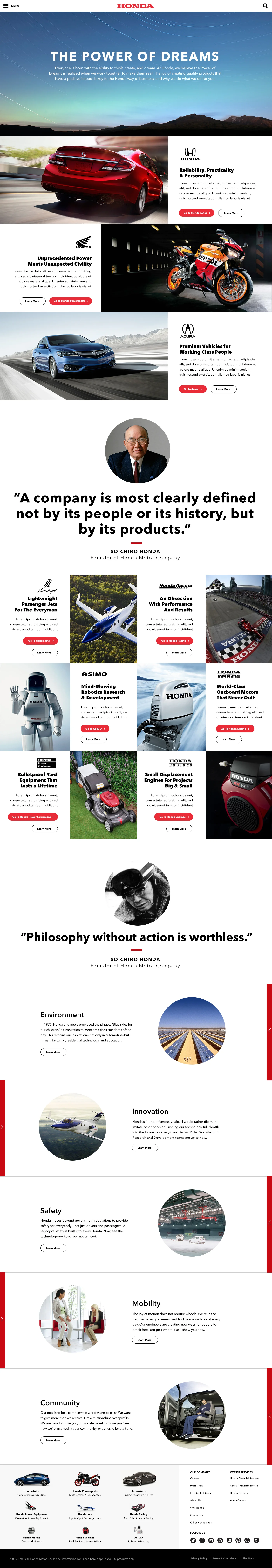 There was an idea floating around that Honda.com could actually replace Corporate.Honda.com as a source of information about the company as whole as opposed to primarily an exit grid. This exploration sought to answer that ask. The top portion remained largely the same, but everything else was overhauled. Bigger imagery, more information at the top level and more diggable content for each division section was the first step. Then we replaced the content hub with a more robust section that more thoroughly explains Honda's key corporate pillars.
